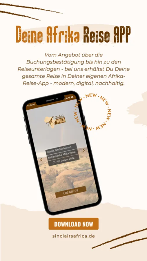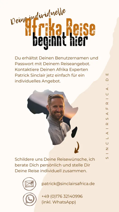 Dann melde Dich mit Deiner Reiseanfrage bei uns und wir stellen Dir Dein individuelles Reiseangebot hier in der App bereit inkl. persönlichen Zugangsdaten. Du erreichst uns per E-Mail unter travel@sinclairsafrica.de und per WhatsApp unter +49 176 32140996.