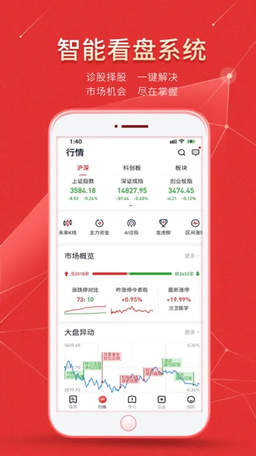 【急速行情】支持查看沪深市场、科创板以及板块实时急速行情,提供股票实时行情查询及排行榜单,还提供未来K线、主力资金、AI诊股、龙虎榜、股票异动等行情增值服务。