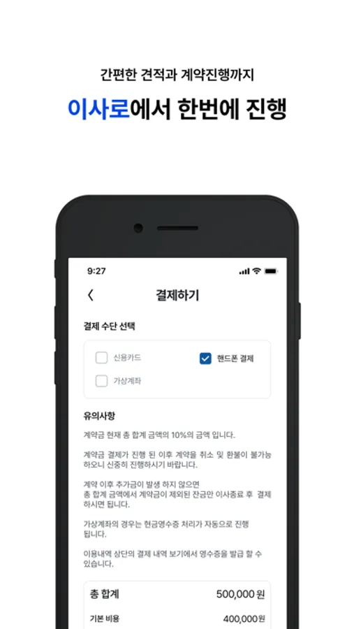 :이사의 시작부터 마무리까지 모든 결제는 이사로 앱에서 신용카드 등 다양한 결제수단으로 진행할 수 있어 편리합니다. 영수증 발급은 덤!