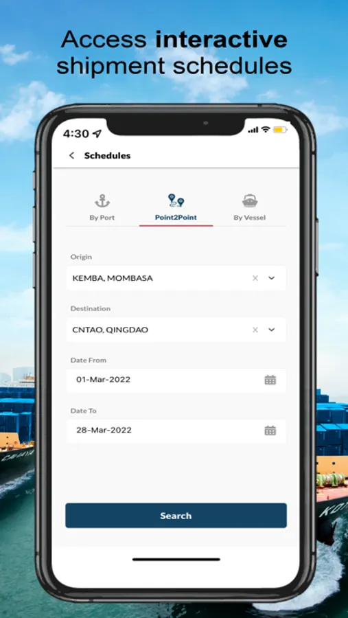 - Interactive shipment schedule by port, point-to-point, and by vessels, as well as our service network coverage.
