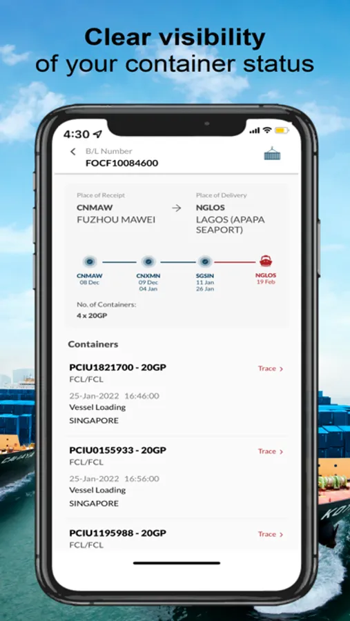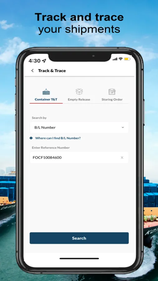 - Trace your shipments by container number, booking number, BL number or PO number.