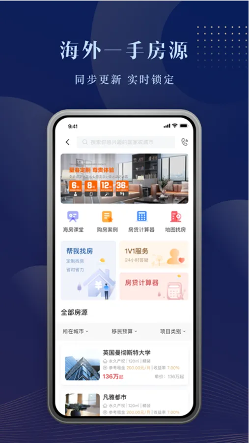 【海外房产】联合全球优质房企,挖掘具有高价值、潜力大的房地产投资机会,精选优质房源,满足您海外投资、移民自住及以房养学等需求。房产类型包括公寓住宅、土地别墅、商业地产。同时提供全球范围的物业购置、房屋租售、装修设计、物业管理等一站式服务,帮助您轻松投资海外物业。