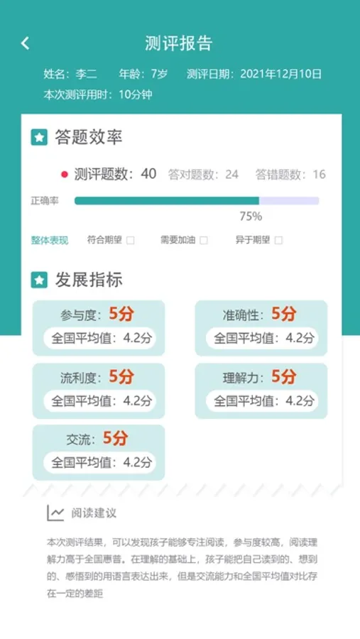 旺豆阅读测评是旺豆教学研究中心研发的一款致力于给K12阶段儿童提供个性化阅读服务的学习工具。它利用专业的阅读培养理念和手段,将阅读能力细分为参与度、准确性、流利度、理解力和交流五大目标,测查儿童阅读素养发展状况,帮助教师和家长清晰地了解儿童的阅读水平所处的阶段,并给与科学合理的阅读培养建议。