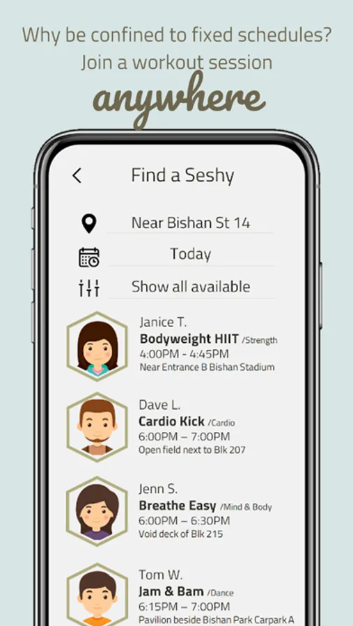 Break free from rigid schedules, confined spaces, and long travelling time. Your gateway to a more exciting workout starts with Seshy.