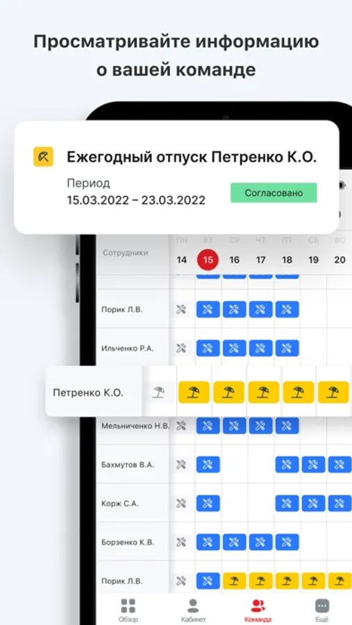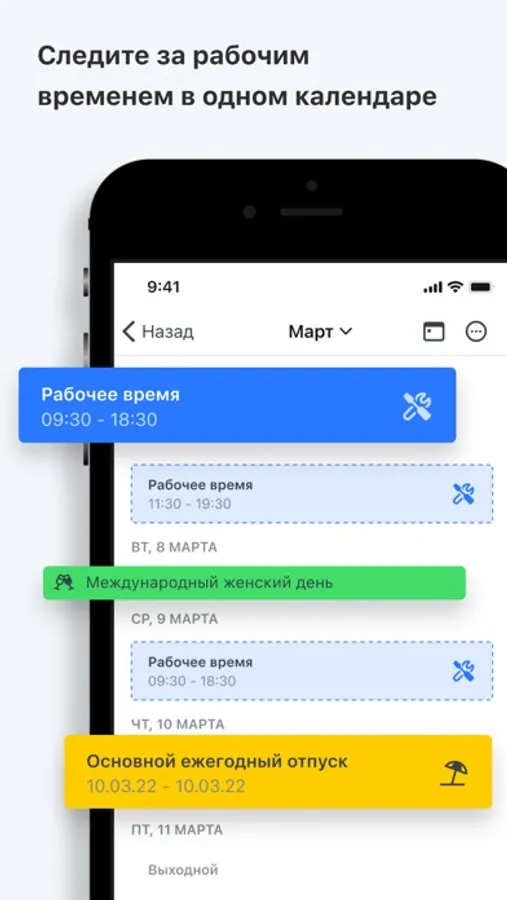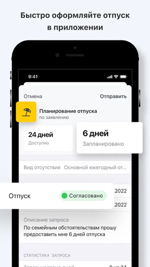- Отсутствия: календарь отсутствий, возможность подать заявление на отпуск.