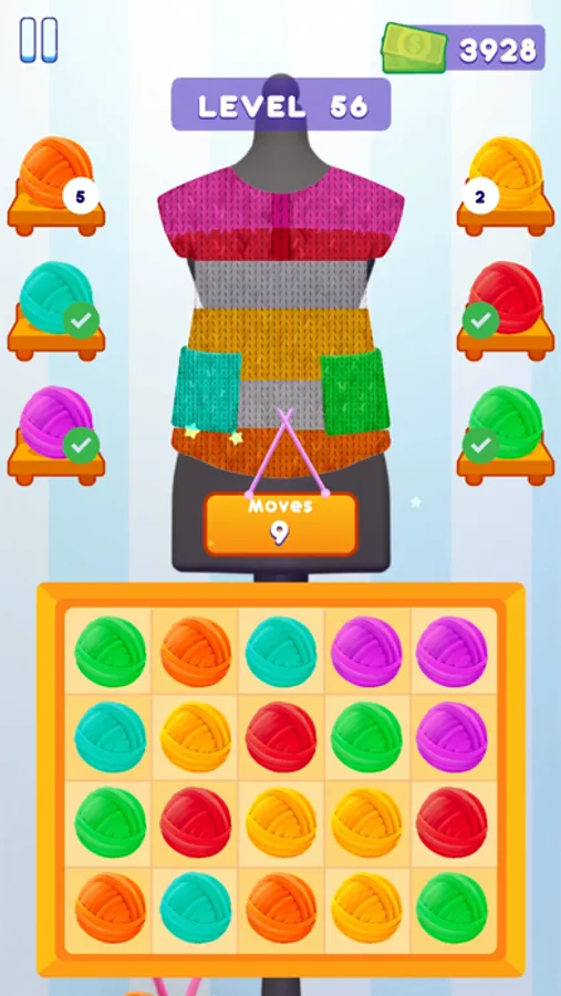 Match at least 3 wool threads and earn wool yarns of the same color. Watch the wool yarns knit the clothes according to the color and pattern on each clothing item. Try to make bigger matches at once to earn multiple yarns and finish knitting before you run out of moves!