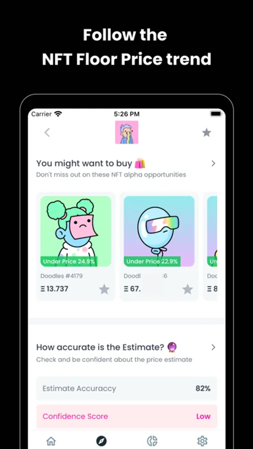 Easily explore the most popular NFT collections in the market. In each collection, you’ll find the NFTs listed below the estimated price, powered by NFTBank’s highly accurate ML model.