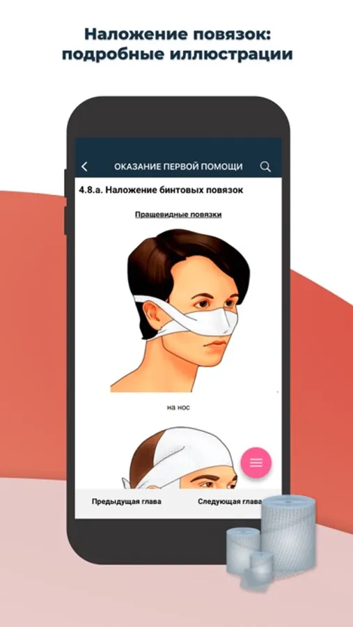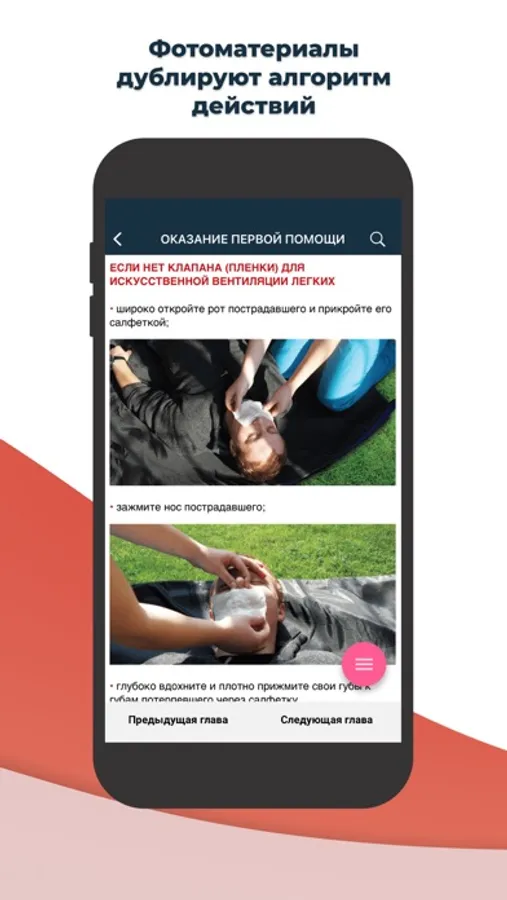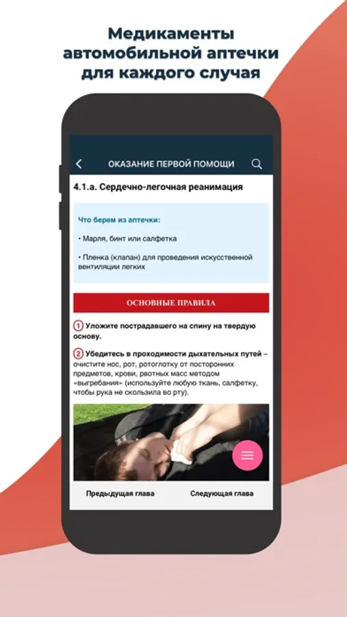 Приложение представляет собой пособие по оказанию экстренной медицинской помощи при ДТП. Содержит в себе алгоритм действий в первые минуты после аварии, особенности оказания первой помощи в тяжелых условиях, а также: