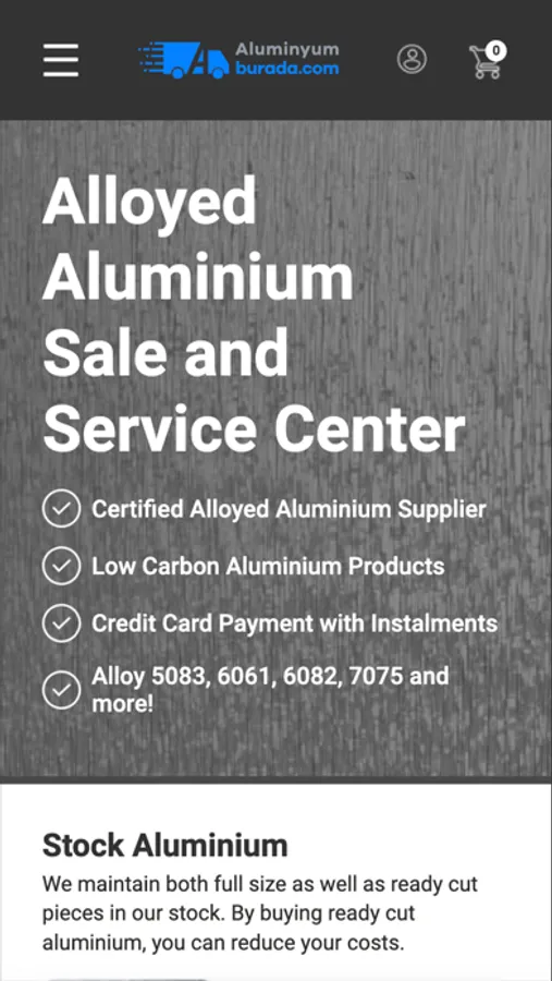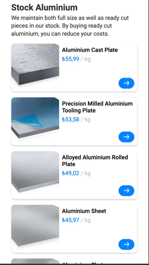 With the Aluminyumburada.com mobile app, you easily reach of our aluminium products from your mobile phone, browse their specifications and prices. You can either view our ready cut stock products or make a custom sizing request. You can use our aluminium weight calculator to find the weight of your products or view our blogs regarding information about aluminium.