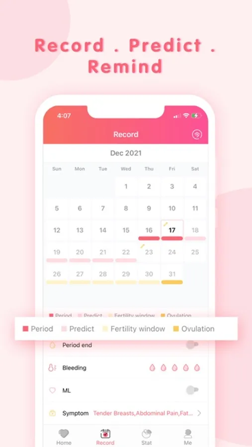 * Records include bleeding volume, 22 common menstrual symptoms, and private records