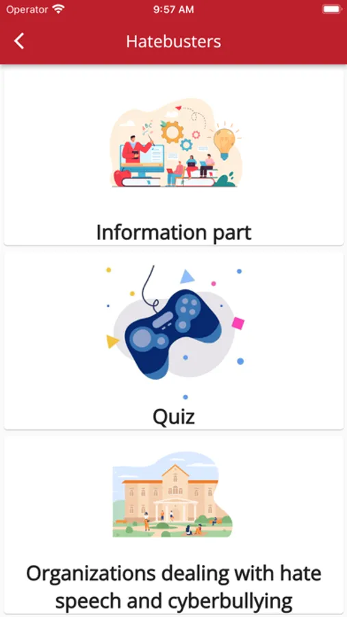 HateBusters App is a mobile app that will have the aim to educate both young people and youth workers on real life cases of hate speech. The app will include information about how to recognize hate speech, different levels of hate speech and how to respond/address it. The app will have two profiles one for youth workers-educators and one for young people. The app apart from the information part, will include a simulation game where the user will choose a profile and he/she will respond to hate speech cases.