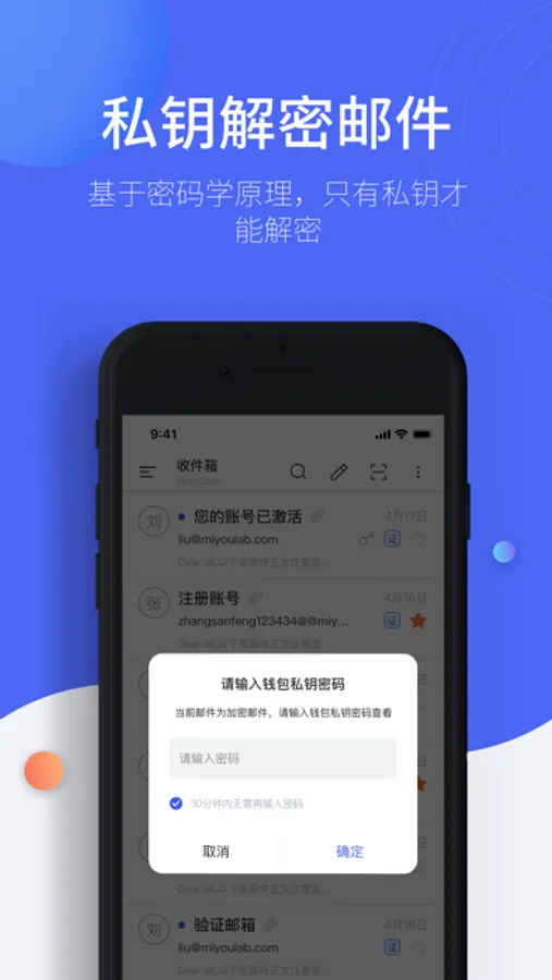 MiYou加密邮箱使用区块链技术,非对称加密数据,只有你自己的私钥可以解密邮件;用户数据加密处理,全程SSL加密传输,保障数据传输安全;