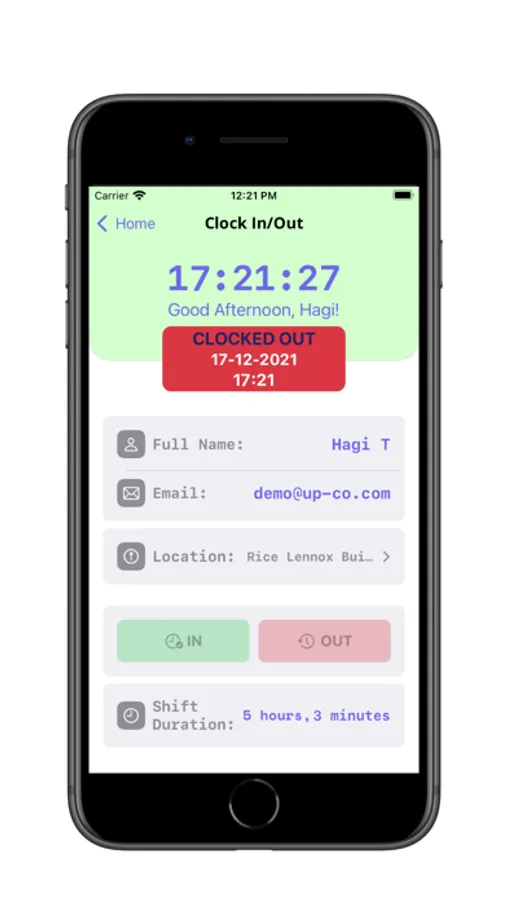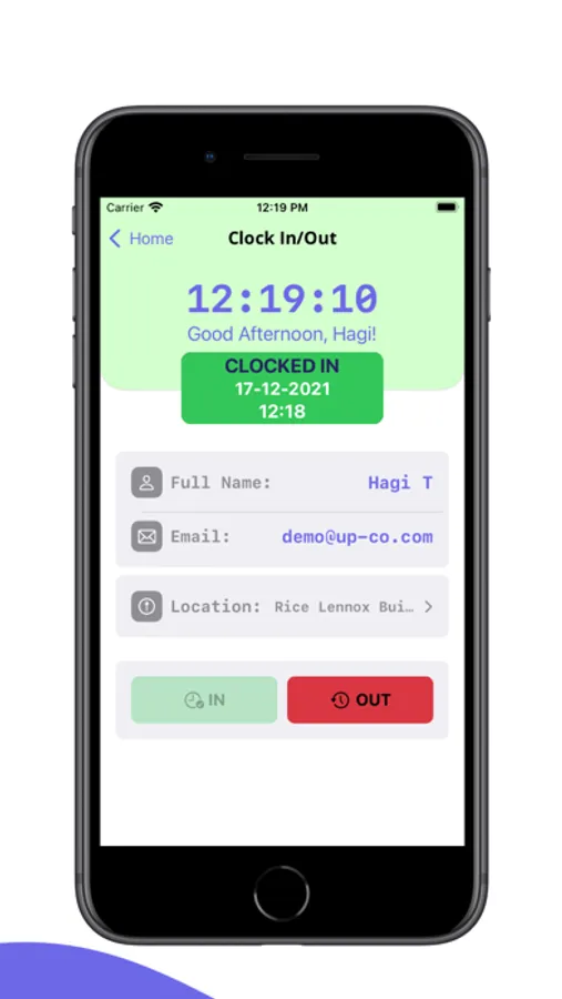 UpCo Clock In/Out is a time tracking tool with advanced clock-in and clock-out functionality for managing working time and employee attendance at specific locations.