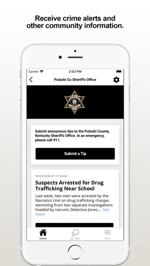 The PulaskiCo Sheriff app provides citizens the ability to submit anonymous tips to the Pulaski County, Kentucky Sheriff's Office. The app also displays agency crime alerts and other organization web and social media content.