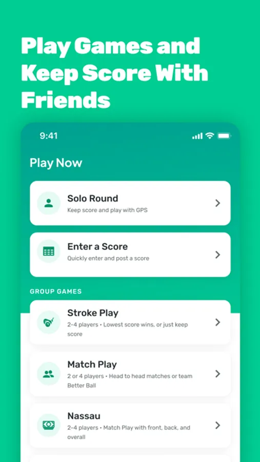 - On-course games, including Match Play, Nassau, Skins, Nines and Stroke Play