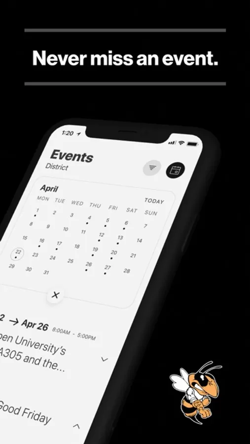 The event section shows a list of events throughout the district. Users can add an event to their calendar to share the event with friends and family with one tap.