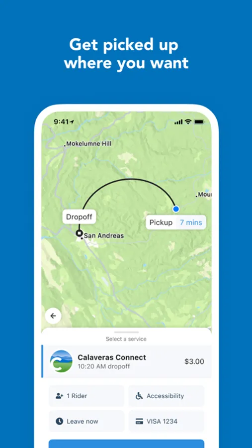 The Calaveras Connect rider app allows you to book rides in advance and request preferred pick-up/drop-off times, monitor bus arrival, and receive notifications. You can also pay on the app and use the interactive map to locate the bus pick-up location and get trip directions.