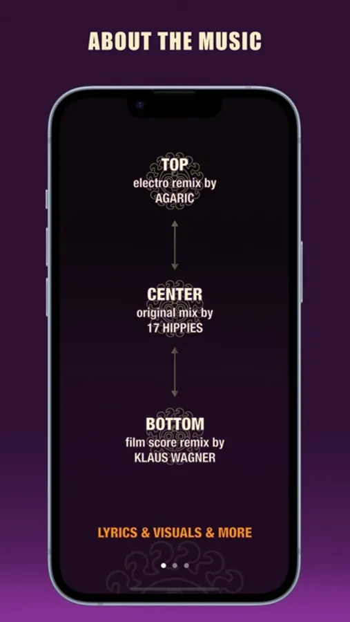 In this app you can blend 17 original tracks by 17 Hippies with remixes by electro DJ AGARIC and film composer KLAUS WAGNER.