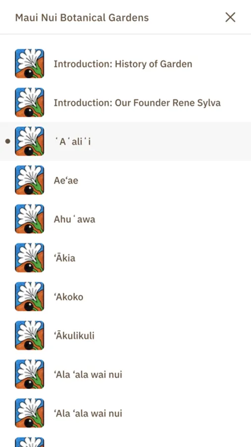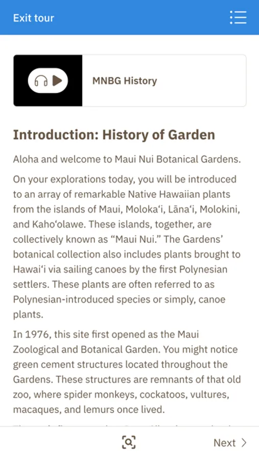 This self-guided audio tour helps give context to the native and canoe Hawaiian plants growing at Maui Nui Botanical Gardens in Kahului, Hawaii. Explore the 5-acre Gardens at your own pace to appreciate the plants for their value to Hawaii culture, history, and ecology. Plant I.D. signs have QR codes accessible by the scan and find button or look up plants alphabetically by name.