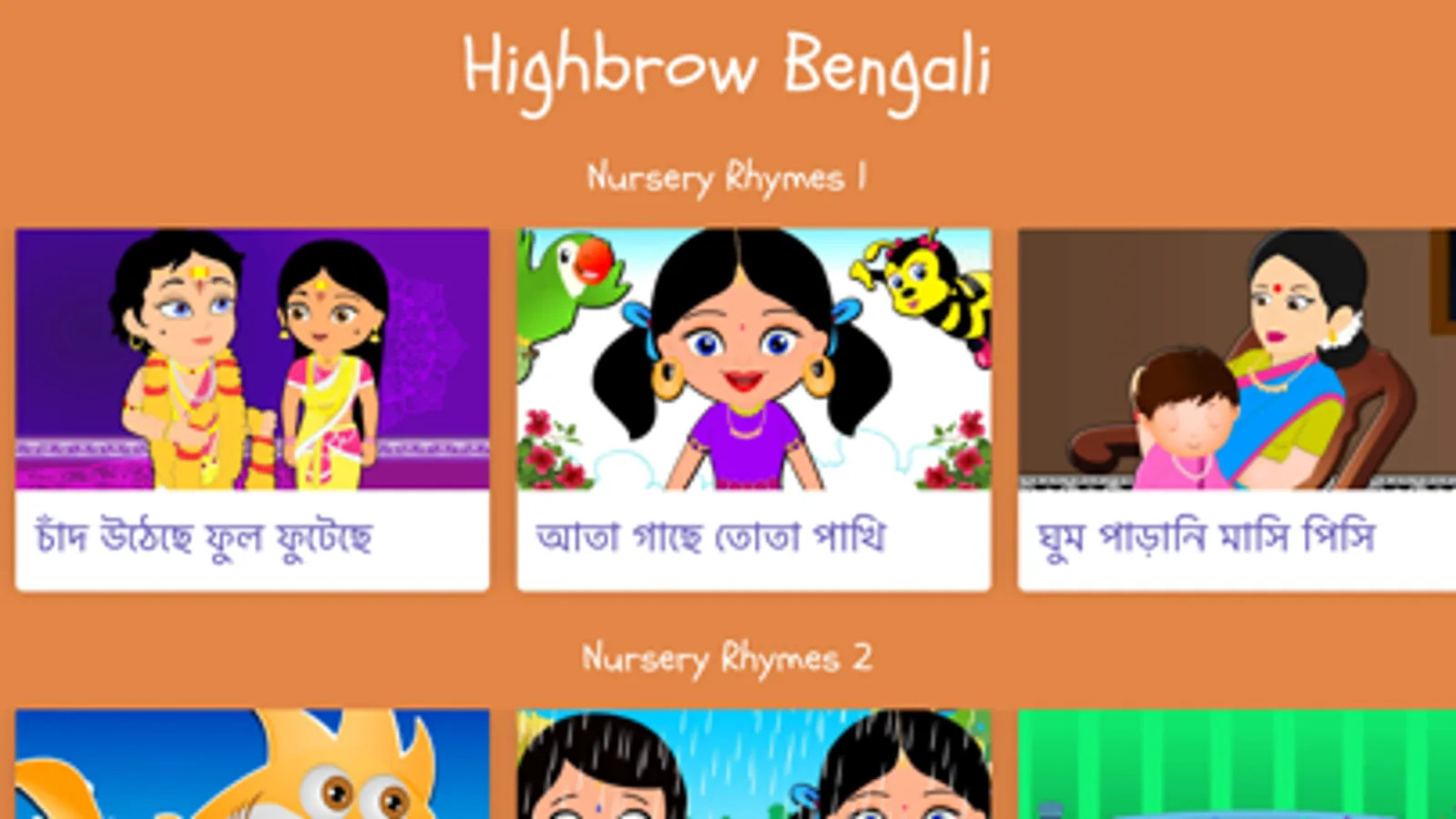 Highbrow Bengali curates the BEST Bengali stories, nursery rhymes and vocabulary videos in the world and puts them in one child friendly, ad-free app.