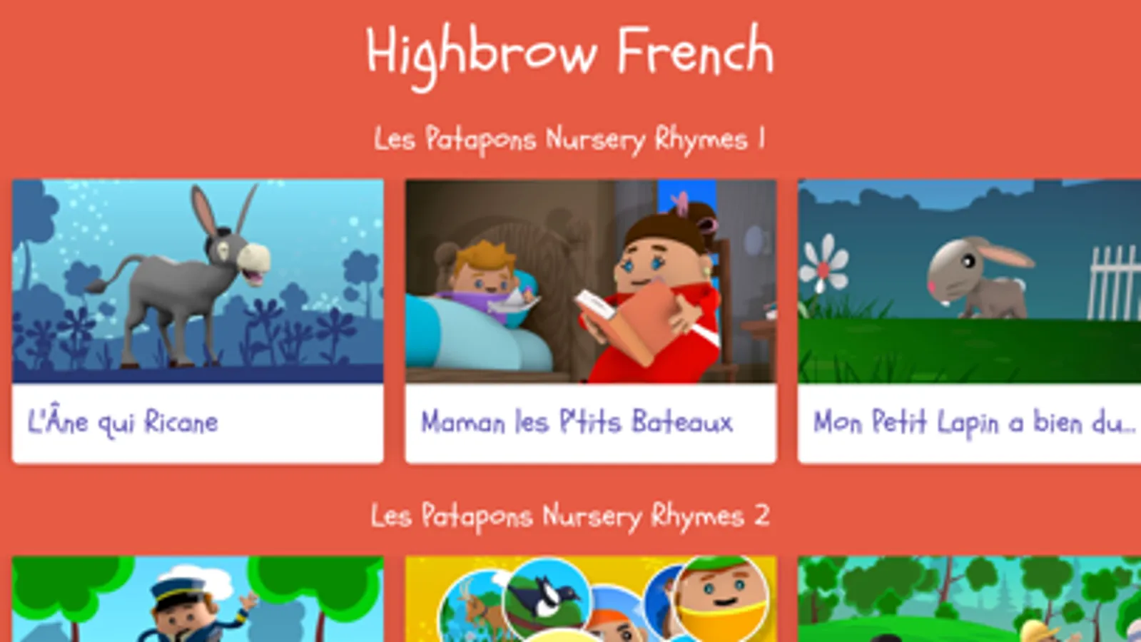 Highbrow French curates the BEST French stories, nursery rhymes and vocabulary videos in the world and puts them in one child friendly, ad-free app.