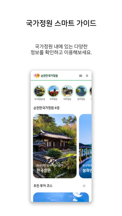 순천만 국가정원 앱은 국가정원 내의 정원들을 안내하고 좀더 편리하게 이동할 수 있는 추천 코스들을 소개하고 있습니다.