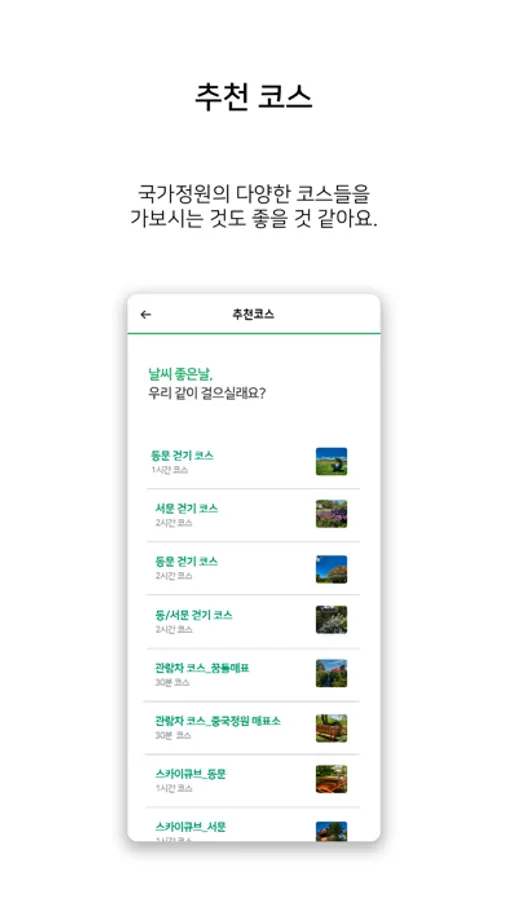 - 음성 가이드 : 국가정원 내 정원들의 스토리텔링 모바일 음성 가이드을 들을 수 있습니다.