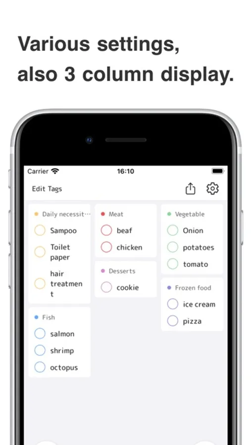 First of all, it's incredibly easy to organize your shopping list since you can display it in two columns for each tag. You can also make your shopping list easier to read by displaying it with colorful tags.