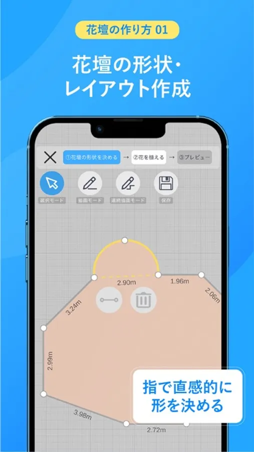 初めに花壇の形状・レイアウトを作ります。指で直感的に形を決めます。