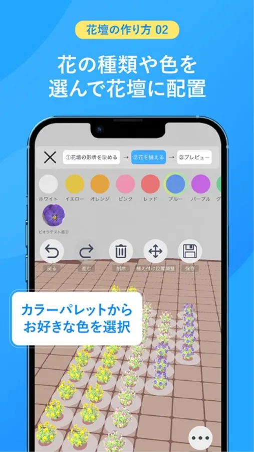 花壇の形状を決めたら、花を選んで自由に配置していきます。カラーパレットからお好きな色、花を選択して花壇に配置していきます。