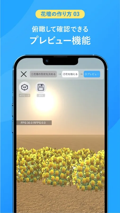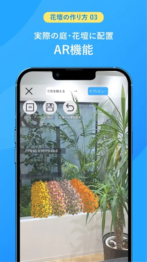 花を置いたらプレビュー画面から俯瞰して眺めてみます。実際の庭や花壇の場所で花を配置したイメージを見たい場合はARプレビューに切り替えましょう。