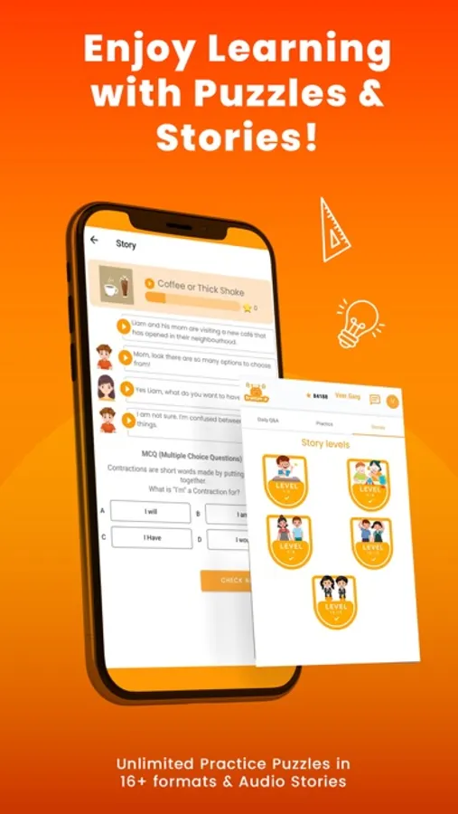 Children between age 5-12 years enjoy learning with over 16 + gamified fun formats including crosswords, grid questions etc and audio stories with instant answers!