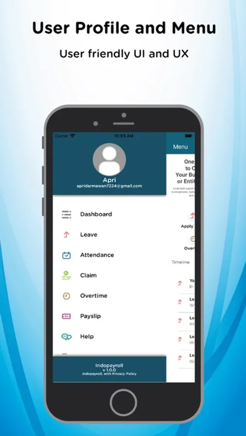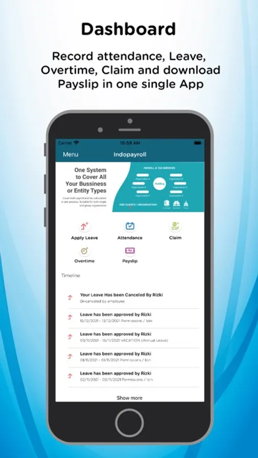 The Indopayroll App provides secure, simple mobile access and integrated to Web App and Payroll processes for employee and manager daily on-the-go self-services.
