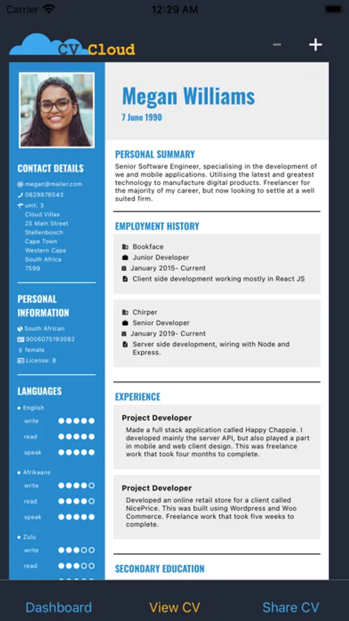 CV Cloud is a free app that makes creating and sharing a professional Curriculum Vitae easy. The app assists you in creating a professional CV, by providing samples and examples that guide you every step of the way.