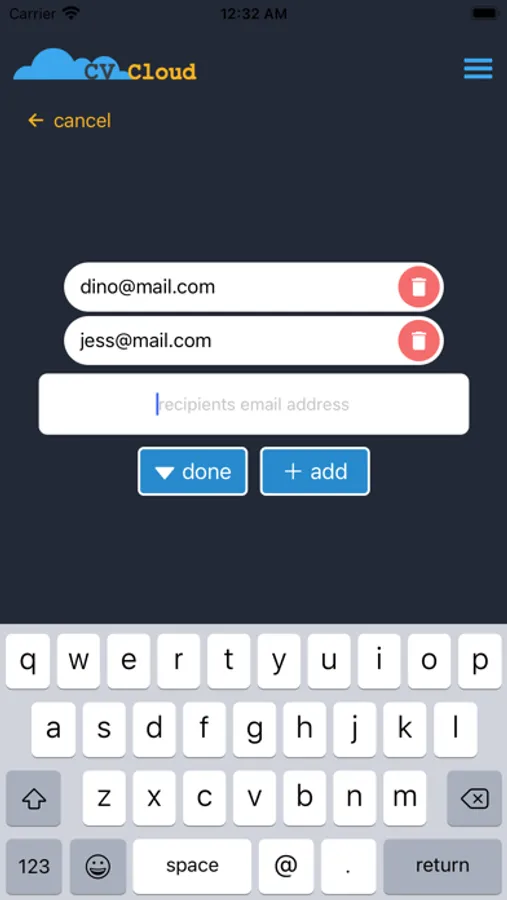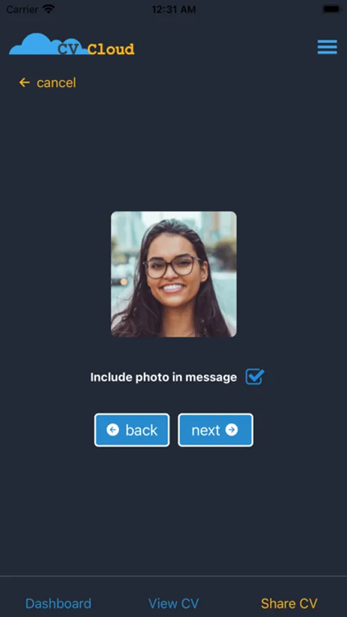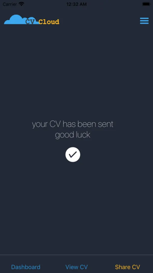 Sharing your CV can be done from within the app by simply listing the email addresses of your recipients, and adding a cover letter or you have the option to download your CV.