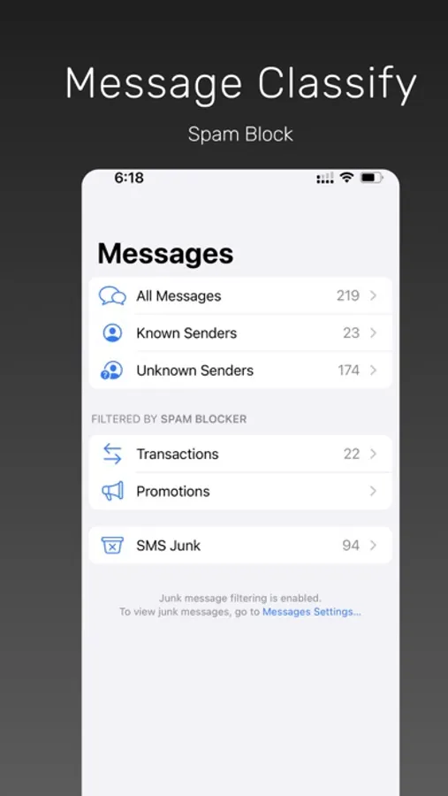 Spam Blocker is the most powerful SMS filtering app for iOS . It can classify incoming messages as normal, junk, transaction or promotion.