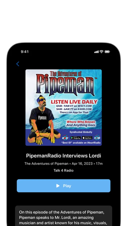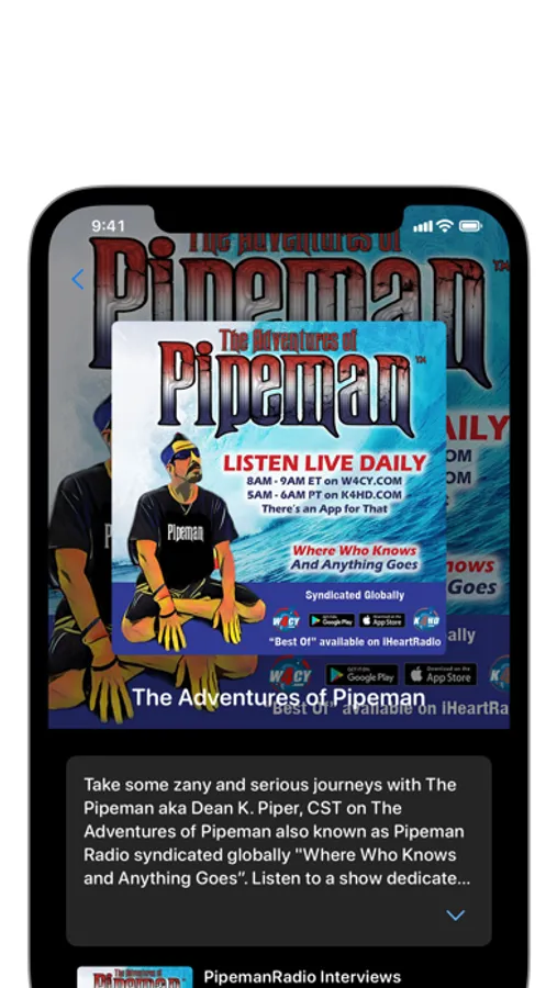 Pipeman Radio also consists of multiple podcasts showing the many sides of Pipeman. These include The Adventures of Pipeman, Pipeman in the Pit, and Positively Pipeman and more. You can find all of the Pipeman Podcasts anywhere you listen to podcasts. With thousands of episodes that focus on Intertainment which combines information and entertainment there is something for everyone including over 5000 interviews with celebrities, music artists/bands, authors, speakers, coaches, entrepreneurs, and all kinds of professionals.