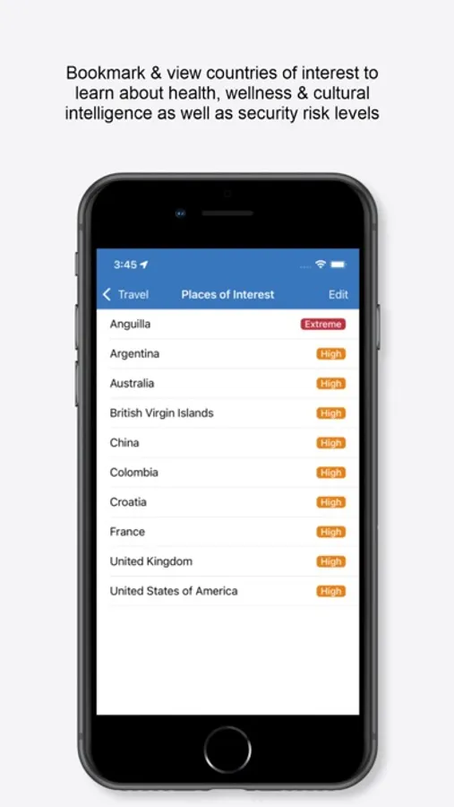 - follow countries you’re interested in to learn about health, wellness & cultural intel as well as the security risk level.