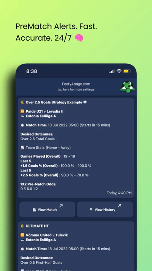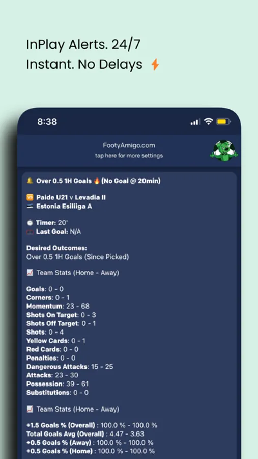 The Footy Amigo app sends you PreMatch and InPlay alerts from your created strategies on Footy Amigo.