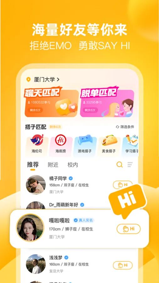 在校猿,你可以通过发布搭子,聊天匹配等多种个性化的交友推荐方式与同城同校及附近的TA聊天互动,超多用户在校猿快速匹配找到了心仪的TA、知心好友!不想再孤单EMO,那就赶紧下载校猿和小姐姐/小哥哥大胆SAYHI吧!