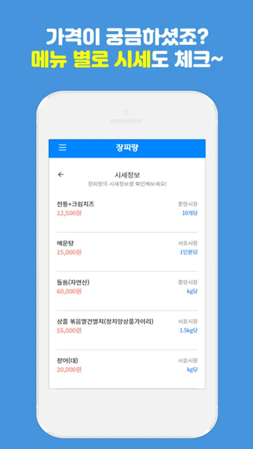메뉴 별로 평균 시세를 체크할 수 있습니다.