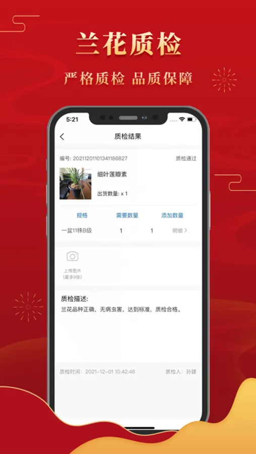 逐件质检,独立的质检环节还会对瑕疵兰花商品进行排查,拦截明显瑕疵的兰花商品。
