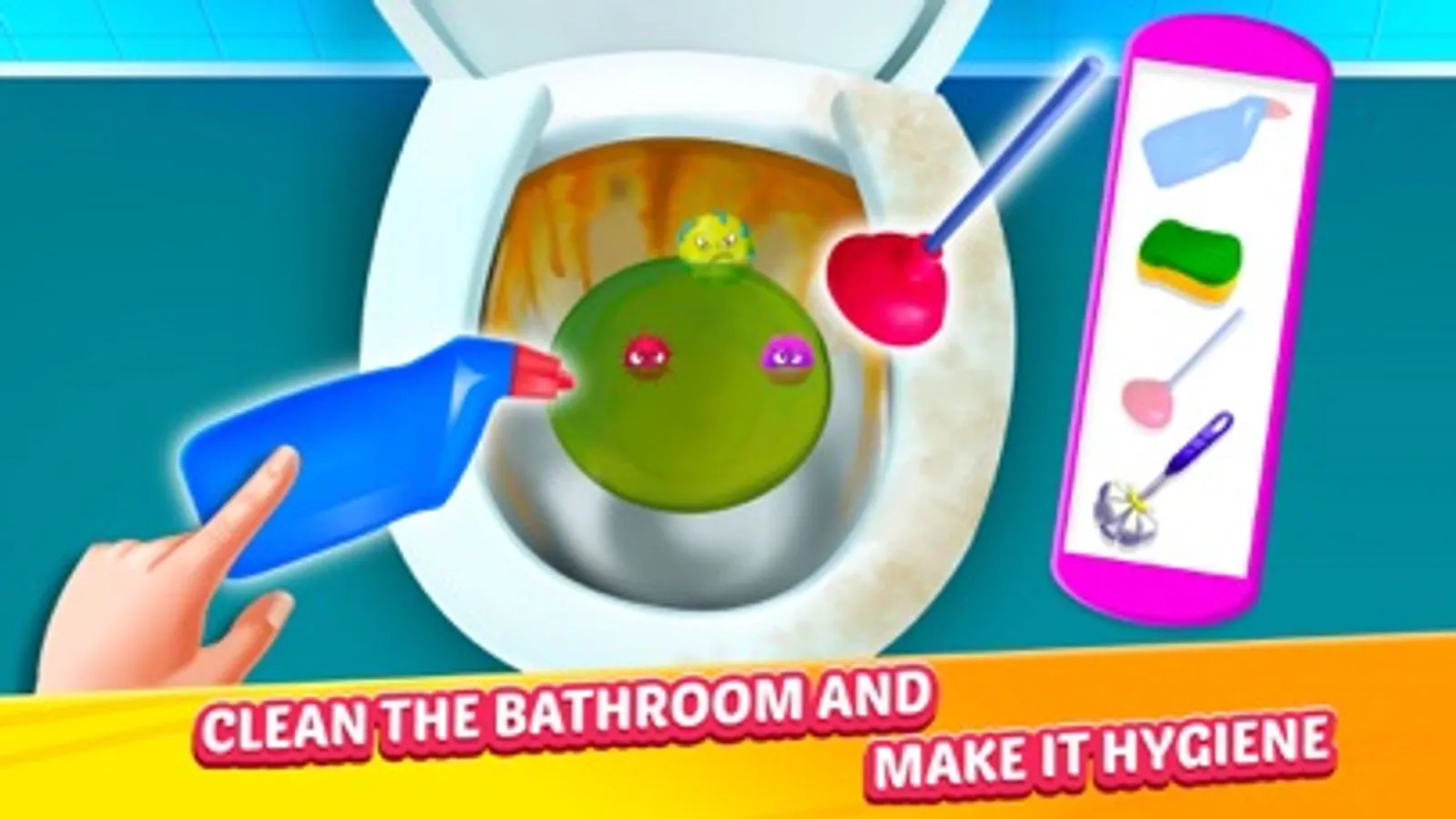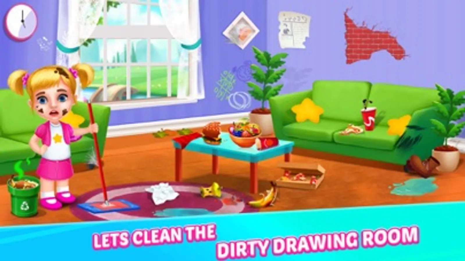 Play house cleaning game and fix the messy house. Clean up the drawing room, kitchen, toilet, bathroom, fix the cycle, clean the garden, pet house, and swimming pool. Play small puzzle game while cleaning your room. Have tons of fun playing in the playground and house cleaning games! Learn how to clean up your room, do laundry, clean the bathroom and wash the dishes.