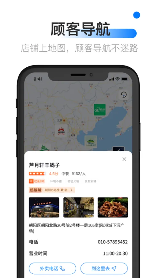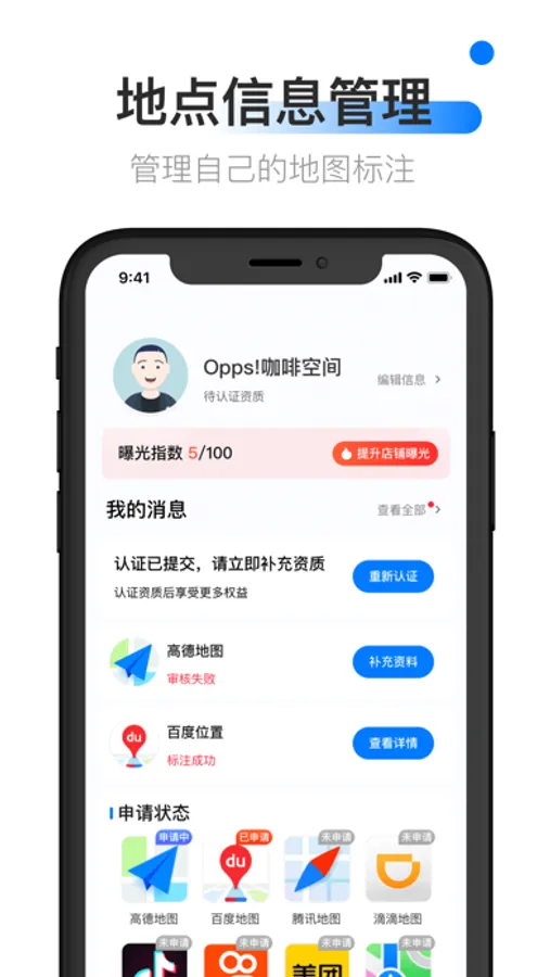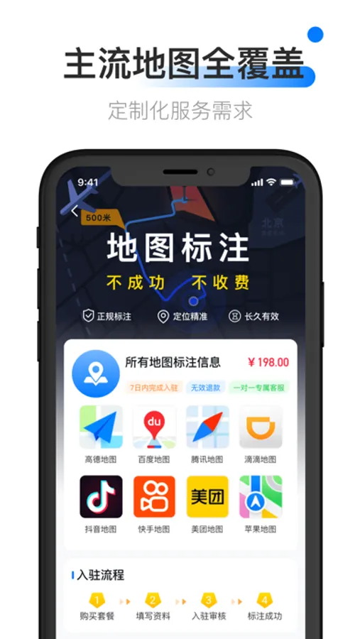 地图标注中心App帮住商家把店铺的地址、电话以及简介等相关信息在地图中进行标注,让商家可以参与地图搜索,同时生成相应的地图名片,方便企业、商家各大网站显示,支持所有地图标注,让您的客户快速找到您的店铺。