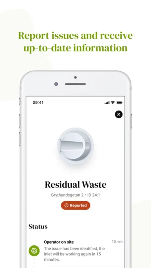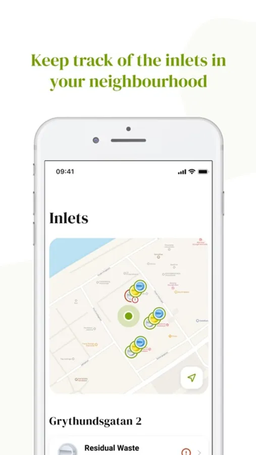 Explore how your waste and recycling is handled in Envac's system, report faulty inlets in your area, and get feedback of fixed issues through the app.