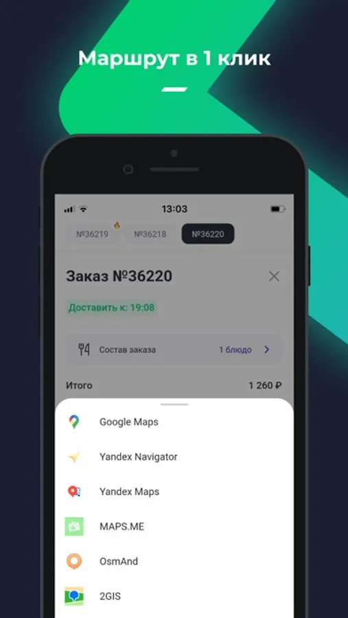 r_k Courier APP – приложение для курьеров, позволяющее в режиме онлайн получать задания на доставку заказов, изменять статусы и строить маршруты до гостей ресторана.