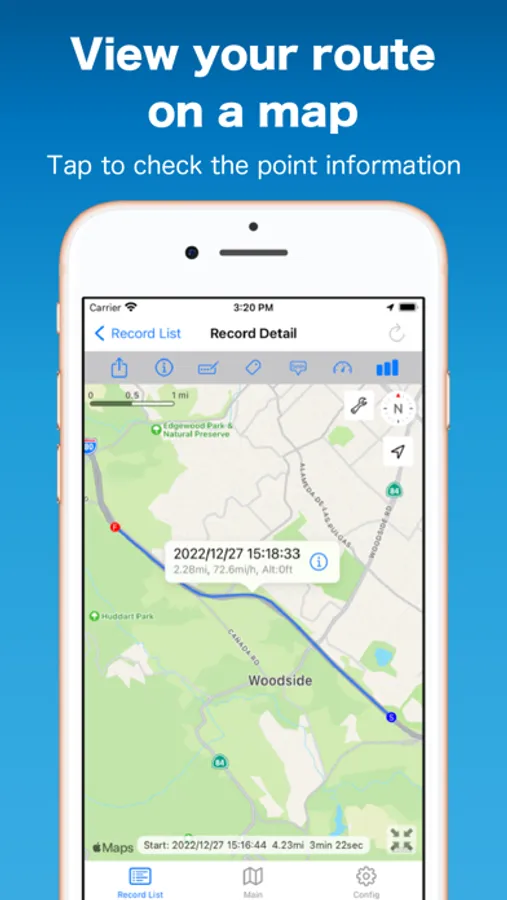 While recording, you can check the route, elapsed time, distance traveled, straight line distance, average speed, and speed at the last recorded time on the screen.