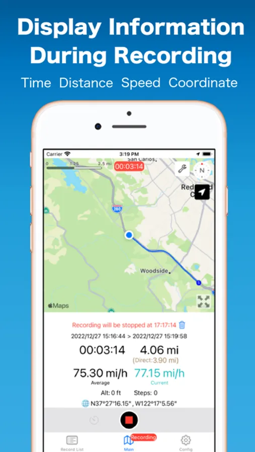 While recording, you can check the route, elapsed time, distance traveled, straight line distance, average speed, and speed at the last recorded time on the screen.