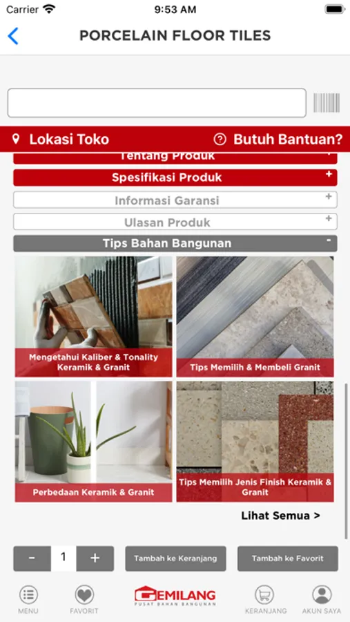 ● Belanja berbagai macam produk favorit bahan bangunan & rumah tangga, mulai dari Keramik, Granit, Perlengkapan Kamar Mandi, Perkakas, Cat & Dekorasi, Perabotan Rumah Tangga dan masih banyak lainnya.