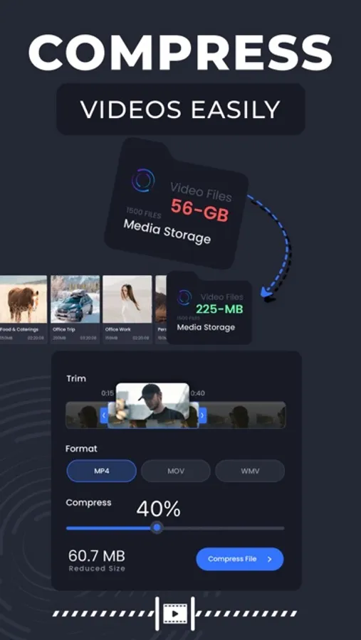 Video Compressor is an excellent mobile application that comes packed with all-important video compression features. This app allows you to easily compress and reduce the size of your videos without compromising on quality or resolution. Compress MP4 videos free, compress M4V videos online.
